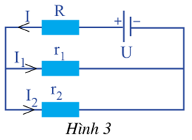 Cho mạch điện như Hình 3. Biết \(U = 20V,R = 0,5\Omega ,\;{r_1} = 1\Omega ,{r_2} = 2\Omega .\) Tìm cường độ dòng điện \({I_1},{I_2},I\) chạy qua mỗi điện trở.