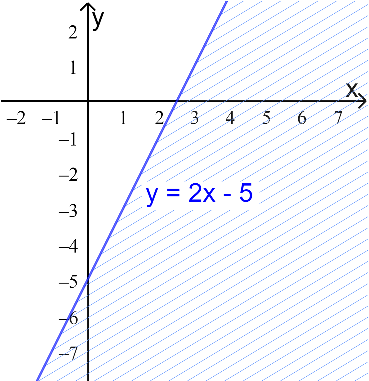 Bước 1: Vẽ đường thẳng \(y = 2x – 5\) đi qua A(0;-5) và B(2.5;0)