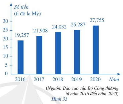 Biểu đồ cột ở Hình 33 biểu diễn kim ngạch xuất khẩu hàng hóa (ước đạt) của tỉnh Bình Dương vào các năm 2016, 2017, 2018, 2019, 2020.