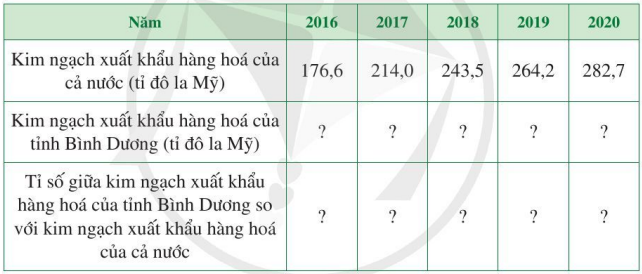 c) Muốn tính tỉ số giữa kim ngạch xuất khẩu hàng hóa của tỉnh Bình Dương so với kim ngạch xuất khẩu hàng hóa của cả nước ta lấy kim ngạch xuất khẩu hàng hóa của tỉnh Bình Dương chia cho kim ngạch xuất khẩu hàng hóa của cả nước.