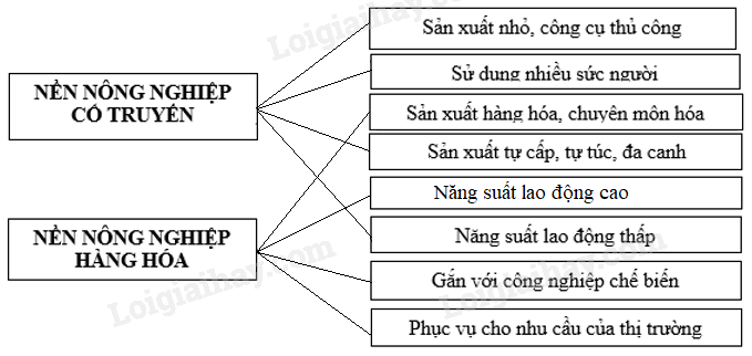 Nối từng ô bên phải với 1 trong 2 ô bên trái sao cho phù hợp với đặc điểm của nền nông nghiệp cổ truyền và nền nông nghiệp hàng hóa.