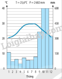 Quan sát hình 1 (trang 43), em hãy cho biết: – Trục bên trái thể hiện yếu tố nào, đơn vị đo của yếu tố đó. – Trục bên phải thể hiện yếu tố nào, đơn vị đo của yếu tố đó. – Thời điểm nhiệt độ cao nhất trong năm, thấp nhất trong năm. – Thời điểm lượng mưa cao nhất trong năm, thấp nhất trong năm.