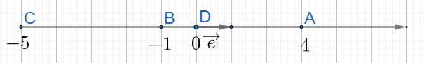 Trên trục \(\left( {O;\overrightarrow e } \right)\) cho các điểm A ,B, C, D  có tọa độ lần lượt là 4; -1; -5; 0