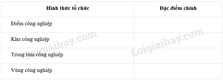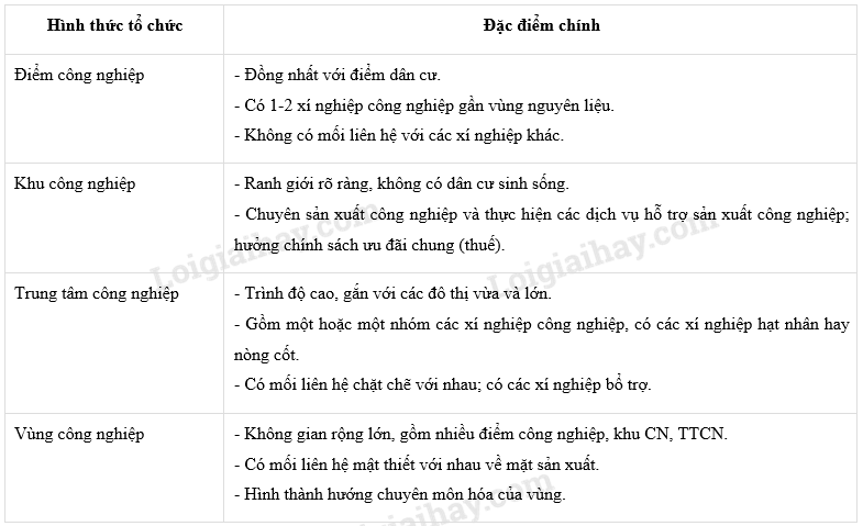 Căn cứ vào kiến thức đã học, hãy nêu những đặc điểm chính của một số hình thức tổ chức lãnh thổ công nghiệp.