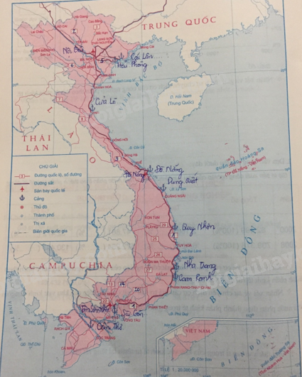 Giải bài 1 trang 53 tập bản đồ Địa lí 12, Điền vào lược đồ Giao thông tên của một vài tuyến quốc lộ, sân bay quốc tế và cảng sau đây: – Quốc lộ: 1,2,5,6,9,14,20 (ghi số đường vào các ô trống trên lược đồ)