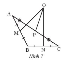 Điểm O trong hình 7 có phải là giao điểm của ba đường trung trực của tam giác ABC hay không? Hãy giải thích.