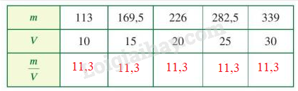 + Tính tỉ số \(\dfrac{m}{V}\)
