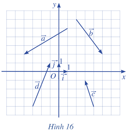 Tìm tọa độ của các vecto trong Hình 16 và biểu diễn mỗi vecto đó qua hai vecto \(\overrightarrow i , \overrightarrow j \)