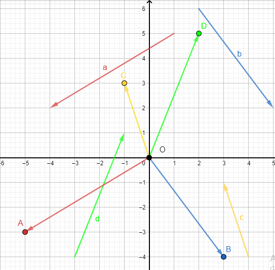 Do đó \(\overrightarrow a  = \overrightarrow {OA}  = \left( { – 5; – 3} \right),\overrightarrow b  = \overrightarrow {OB}  = \left( {3; – 4} \right),\overrightarrow c  = \overrightarrow {OC}  = \left( { – 1;3} \right),\overrightarrow d  = \overrightarrow {OD}  = \left( {2;5} \right)\)