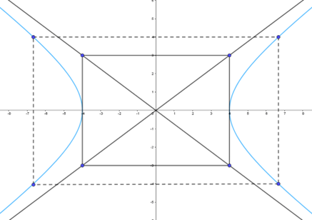 Tìm một số điểm cụ thể thuộc hypebol, chẳng hạn, ta thấy điểm \(M\left( {\frac{{20}}{3};4} \right)\) thuộc (H) và điểm \({M_1}\left( {\frac{{20}}{3}; – 4} \right),{M_2}\left( { – \frac{{20}}{3};4} \right),{M_3}\left( { – \frac{{20}}{3}; – 4} \right)\) thuộc (H)