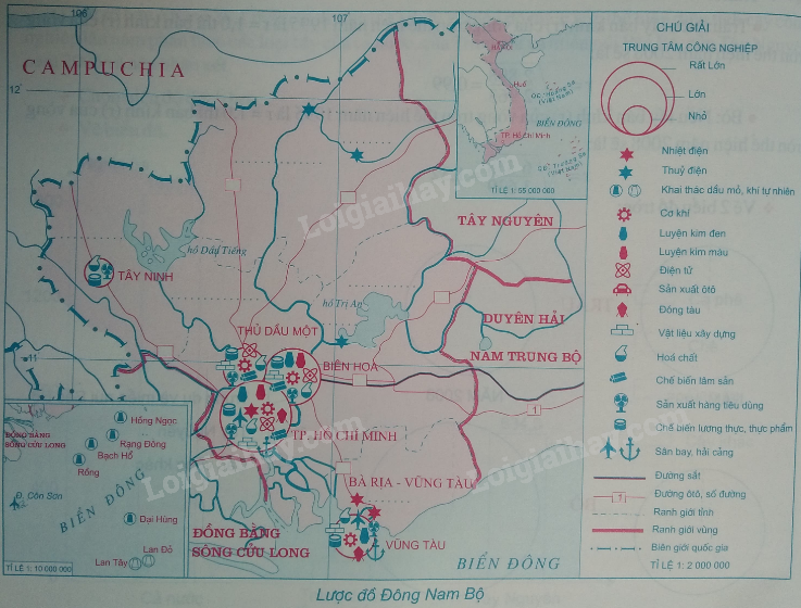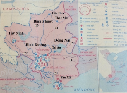 Giải bài 1 trang 70 tập bản đồ Địa lí 12, Hãy điền vào lược đồ: – Tên các tỉnh Tây Ninh, Bình Dương, Bình Phước, Đồng Nai.