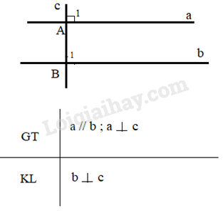 Vẽ hình, viết giả thiết, kết luận của định lí: “ Một đường thẳng vuông góc với một trong hai đường thẳng song song thì nó cũng vuông góc với đường thẳng còn lại”.