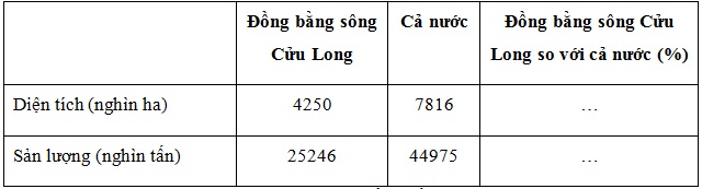 a) Tình tỉ lệ diện tích và sản lượng lúa của Đồng bằng sông Cửu Long so với cả nước, điền kết quả vào ô trống (…) trong bảng.