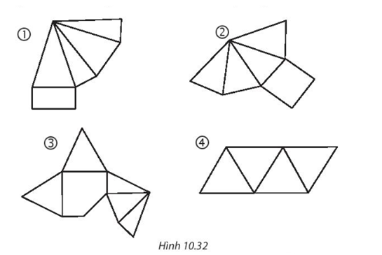 Trong các miếng bìa ở Hình 10.32, miếng bìa nào khi gấp và dán lại thì được một hình chóp tam giác đều, miếng nào được hình chóp tứ giác đều.