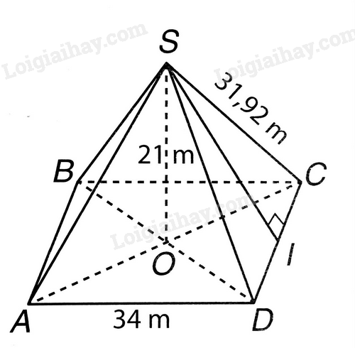 b) Tính tổng diện tích các tấm kính để phủ kín bốn mặt bên hình chóp này, biết rằng người ta đo được độ dài cạnh bên của hình chóp là 31, 92m.