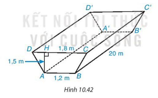 Người ta đào một đoạn mương có dạng hình lăng trụ đứng tứ giác như hình 10.42. Biết mương có chiều dài 20m , sâu 1,5 m, bề mặt có chiều rộng 1,8 m và đáy mương rộng 1,2 m. Tính thể tích đất phải đào lên.