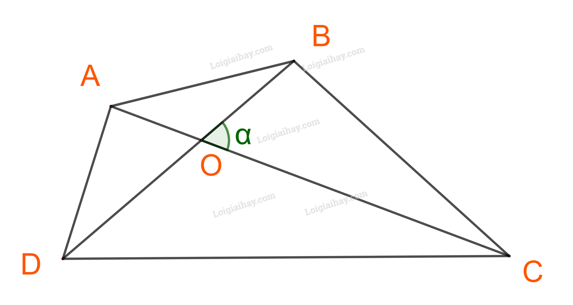 Cho tứ giác lồi ABCD có các đường chéo \(AC = x,BD = y\) và góc giữa AC và BD bằng \(\alpha .\) Gọi S là diện tích của tứ giác ABCD.