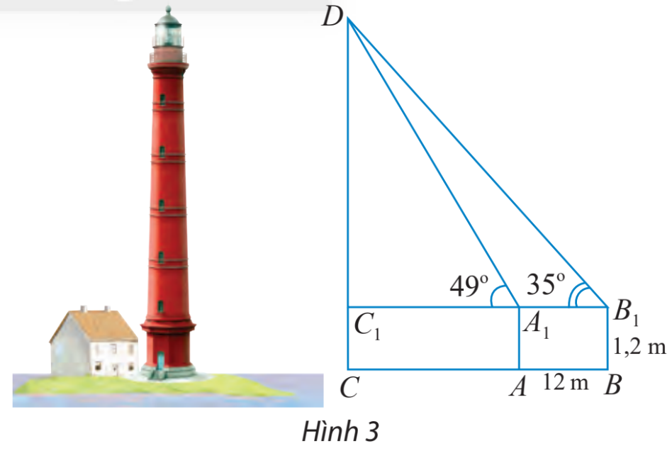 Muốn đo chiều cao của một ngọn tháp, người ta lấy hai điểm A, B trên mặt đất có khoảng cách \(AB = 12m\) cùng thẳng hàng với chân C của tháp để đặt hai giác kế. Chân của hai giác kế có chiều cao là \(h = 1,2m.\) Gọi D là đỉnh tháp và hai điểm \({A_1},{B_1}\) cùng thẳng hàng với \({C_1}\) thuộc chiều cao CD của tháp. Người ta do được \(\widehat {D{A_1}{C_1}} = {49^ \circ },\widehat {D{B_1}{C_1}} = {35^ \circ }.\) Tính chiều cao CD của tháp.