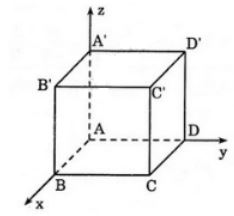Chọn hệ trục tọa độ như hình vẽ có: \(O \equiv A,\;\;B \in Ox;\;D \in Oy,A’\in Oz.\)