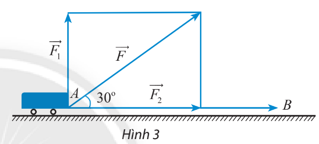 Một xe goòng được kéo bởi một lực \(\overrightarrow F \) có độ lớn là là 50 N, di chuyển theo quãng đường từ A đến B có chiều dài là 200 m. Cho biết góc giữa lực \(\overrightarrow F \) và \(\overrightarrow {AB} \) là \(30^\circ \) và  \(\overrightarrow F \) được phân tích thành 2 lực \(\overrightarrow {{F_1}} ,\overrightarrow {{F_2}} \) (hình 3). Tính công sinh ra bởi các lực \(\overrightarrow F ,\overrightarrow {{F_1}} \) và \(\overrightarrow {{F_2}} \).