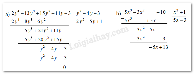b) \((5{x^3} – 3{x^2} + 10):({x^2} + 1)=5x-3+\dfrac{-5x+13}{x^2+1}\)