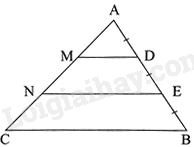 Cho tam giác ABC có cạnh \(BC = 10cm\). Trên cạnh AB lấy các điểm D, E sao cho \(AD = DE = EB\). Từ D, E kẻ các đường thẳng song song với BC, cắt cạnh AC lần lượt tại M và N. Tính độ dài DM và EN.