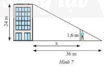 b) Một tòa nhà cao 24m, đổ bóng nắng dài 36m trên đường như Hình 7. Một người cao 1,6m muốn đứng trong bóng dâm của toàn nhà. Hỏi người đó có thể đứng cách tòa nhà xa nhất là bao nhiêu mét?