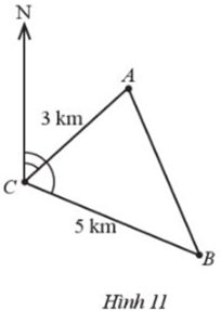Tàu A cách cảng C một khoảng 3 km và lệch hướng bắc một góc 47,450. Tàu B cách cảng C một khoảng 5 km và lệch hướng bắc một góc 112,900 (Hình 11). Hỏi khoảng cách giữa hai tàu là bao nhiêu kilomet (làm tròn kết quả đến hàng phần trăm)?