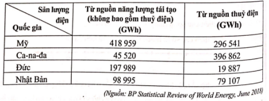 Người ta thường sản xuất điện năng từ hai nguồn năng lượng tái tạo và không tái tạo. Điện năng từ nguồn năng lượng tái tạo là điện năng được sản xuất từ sức nước, sức gió, sinh khối(rác, chất thải,…), địa nhiệt( sức nóng của Trái Đất) và Mặt Trời. Điện năng từ nguồn năng lượng không tái tạo là nhiệt điện, được sản xuất từ các nhiên liệu tự nhiên như than, dầu, khí ga tự nhiên hay khí hidro. Bảng sau cho biết sản lượng diện năm 2017 của các nước Mỹ, Ca- na- đa (Canada), Đức, Nhật Bản