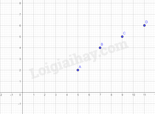 Ta có các điểm \(A,B,C,D\) biểu diễn các điểm có tọa độ là các cặp số \(\left( {x;y} \right)\) tương ứng: \(A\left( {5;2} \right),B\left( {7;4} \right),C\left( {9;5} \right),D\left( {11;6} \right)\)