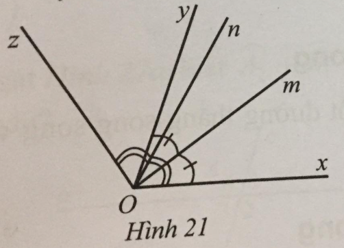Hình 21 có \(\widehat {xOy} = 70^\circ ,\widehat {xOz} = 120^\circ \), hai tia OmOn lần lượt là tia phân giác của góc xOyxOz. Tính số đo mỗi góc yOz, xOm, xOn, mOn.