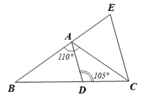Cho tam giác ABC có \(\widehat {A{}^{}} = {110^o}\) và \(\widehat B = \widehat C\) . Trên cạnh BC lấy điểm D sao cho \(\widehat {A{\rm{D}}C} = {105^o}\). Từ C kẻ đường thẳng song song với AD cắt tia BA tại E. Chứng minh: