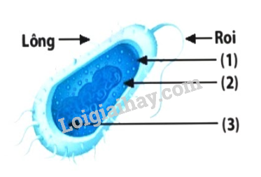 Quan sát hình ảnh bên về vi khuẩn. a) Hoàn thành cấu trúc tế bào vi khuẩn bằng cách gọi tên các số (1), (2), (3). b) Tế bào vi khuẩn thuộc nhóm tế bào nhân sơ hay tế bào nhân thực? Giải thích. c) Dự đoán lông và roi trong cấu trúc tế bào vi khuẩn dùng để làm gì. d) So sánh cấu trúc tế bào trùng biến hình và tế bào vi khuẩn.