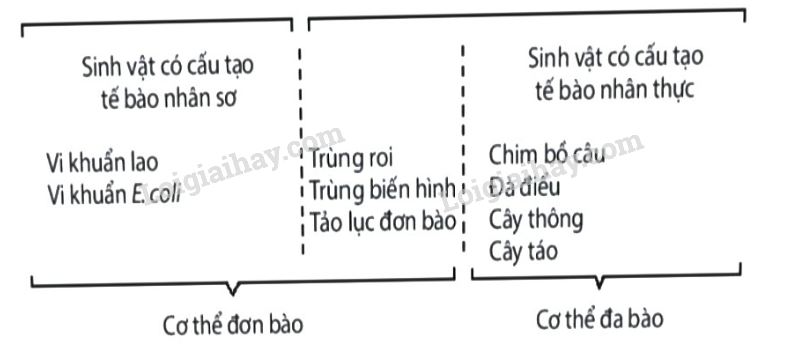 Cho các sinh vật sau: vi khuẩn lao, chim bồ câu, vi khuẩn E. coli, đà điểu, cây thông, trùng roi, cây táo, trùng biến hình, tảo lục đơn bào. Hãy sắp xếp các đại diện trên vào đúng vị trí trên sơ đồ dưới đây:
