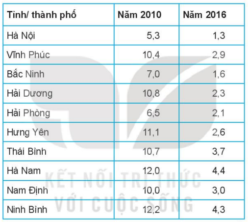 Tỉ lệ hộ nghèo (%) của 10 tỉnh/ thành phố thuộc đồng bằng sông hồng trong năm 2010 và năm 2016 được cho trong bảng sau: