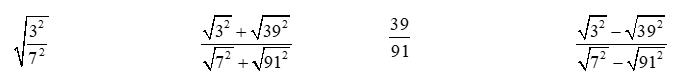 \(\begin{array}{l}\dfrac{{\sqrt {{3^2}}  + \sqrt {{{39}^2}} }}{{\sqrt {{7^2}}  + \sqrt {{{91}^2}} }} = \dfrac{{3 + 39}}{{7 + 91}} = \dfrac{{42}}{{98}} = \dfrac{3}{7}\\\dfrac{{\sqrt {{3^2}}  – \sqrt {{{39}^2}} }}{{\sqrt {{7^2}}  – \sqrt {{{91}^2}} }} = \dfrac{{3 – 39}}{{7 – 91}} = \dfrac{{ – 36}}{{ – 84}} = \dfrac{3}{7}\end{array}\)