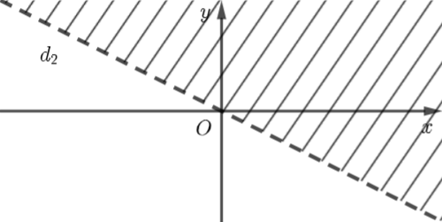 Do đó, miền nghiệm của bất phương trình \(x + 2y < 0\) là nửa mặt phẳng bờ \({d_2}\) không chứa điểm \(A\left( {1;0} \right)\) nhưng bỏ đi đường thẳng \({d_2}\).