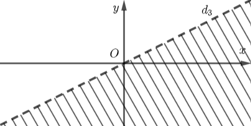 Do đó, miền nghiệm của bất phương trình \( – x + 2y > 0\) là nửa mặt phẳng bờ \({d_3}\) chứa điểm \(A\left( {1;1} \right)\).