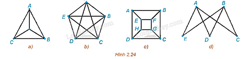 +) Đồ thị Hình 2.24 a) có các đỉnh đều có bậc là 3 nên theo định lí Euler đồ thị này không có chu trình Euler.