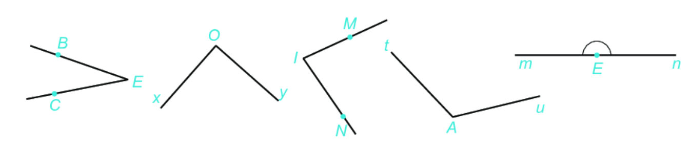 Bài 2 (8.32). Quan sát hình sau: a) Ước lượng bằng mắt xem góc nào là góc nhọn, góc vuông, góc tù, góc bẹt. b) Dùng ê ke để kiểm tra lại kết quả của câu a. c) Dùng thước đo góc để tìm số đo của mỗi góc.