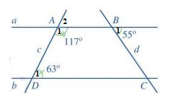 a) Vì \(\widehat {{A_1}} + \widehat {{A_2}} = 180^\circ \) ( 2 góc kề bù) nên \(117^\circ  + \widehat {{A_2}} = 180^\circ  \Rightarrow \widehat {{A_2}} = 180^\circ  – 117^\circ  = 63^\circ \)