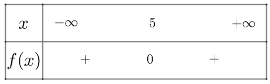 d) Xét tam thức \(f\left( x \right) = {x^2} – 10x + 25\) có \(\Delta  = 0\), có nghiệm kép \({x_1} = {x_2} = 5\) và có \(a = 1 > 0\)