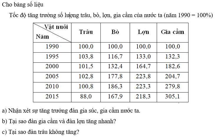Giải bài 2 trang 28 vở bài tập Địa lí 9, Cho bảng số liệu a) Nhận xét sự tăng trưởng đàn gia súc, gia cầm nước ta. b) Tại sao đàn gia cầm và đàn lợn tăng nhanh? c) Tại sao đàn trâu không tăng?