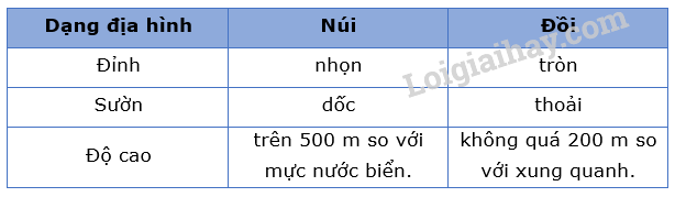 Dựa vào đặc điểm trong bảng trên và các hình ảnh sau đây để vẽ hình một quả núi và một quả đồi vào vở.