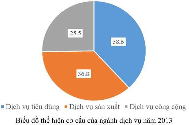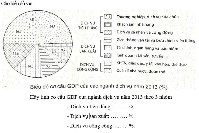 Giải bài 2 trang 34 vở bài tập Địa lí 9, Hãy tính cơ cấu GDP của ngành dịch vụ năm 2013 theo 3 nhóm – Dịch vụ tiêu dùng: …….. %. – Dịch vụ sản xuất: ……… %. – Dịch vụ công cộng: …….. %.