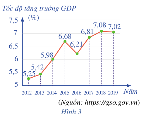 Biểu đồ đoạn thẳng ở Hình 3 biểu diễn tốc độ tăng trưởng GDP của Việt Nam giai đoạn 2012 – 2019.