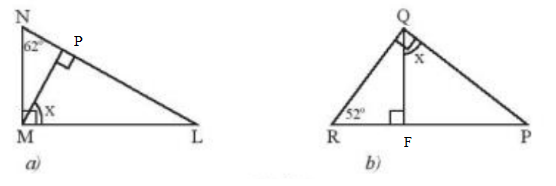 Xét tam giác QFP vuông tại F ta có: \( \Rightarrow \widehat x + \widehat P = {90^o} \Rightarrow \widehat x = {90^o} – {38^o} = {52^o}\)