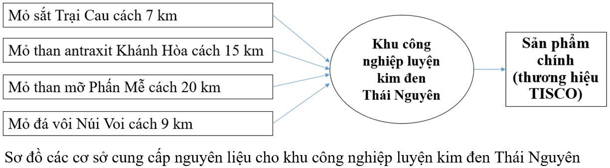 Khu công nghiệp luyện kim đen Thái Nguyên được xây dựng từ đầu những năm 60 của thế kỉ trước. Đặc điểm của khu công nghiệp này là phân bố gần các cơ sở nguyên liệu đầu vào; có thể nói gần như sử dụng nguyên liệu tại chỗ. Không xa về phía tây, khoảng 15km là mỏ than antraxit Khánh Hoà, quá về phía tây bắc, khoảng 20km là mỏ than mỡ Phấn Mê; về phía đông bắc là mỏ sắt Trại Cau, cách 7km, đá vôi được khai thác tại mỏ đá Núi Voi, cách trung tâm nhà máy khoảng 9km. Hiện nay, nhà máy đang được đầu tư đổi mới công nghệ, mở rộng quy mô sản xuất. Thương hiệu thép TISCO của Công ty thép Thái Nguyên đang chiếm thị phần đáng kể trên thị trường thép nội địa.