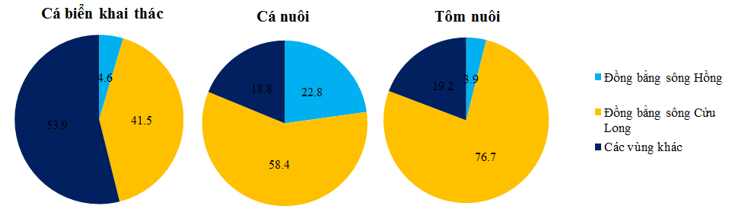 Biểu đồ tỉ trọng sản lượng cá biển khai thác, cá nuôi, tôm nuôi của đồng bằng sông Cửu Long và đồng bằng sông Hồng so với cả nước (%).