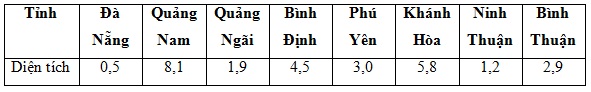 – Quảng Nam có diện tích mặt nước nuôi trồng thủy sản lớn nhất (8,1 nghìn ha), tiếp theo là Khánh Hòa (5,8 nghìn ha), Bình Định (4,5 nghìn ha), Phú Yên (3 nghìn ha),… và tỉnh có diện tích mặt nước nuôi trồng thủy sản thấp nhất là Đà Nẵng (0,5 nghìn ha).